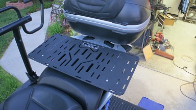 The luggage platform is constructed of 1/4" thick 6061 T6 aluminum alloy. It has many tie down points for attaching either bungee cords or straps. The back side of the platform has grooves to catch the bungee cord hooks so they don't slide out.